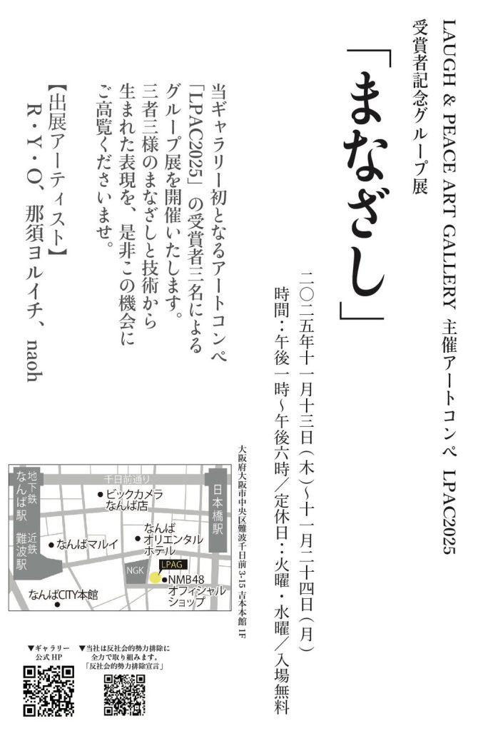 今年1月、LAUGH & PEACE ART GALLERY初となるアートコンペLPAC2025にてギャラリー賞を受賞したR・Y・O、那須ヨルイチ、オーディエンス賞を受賞したnaohの三名による受賞者記念グループ展をこのたび開催いたします。