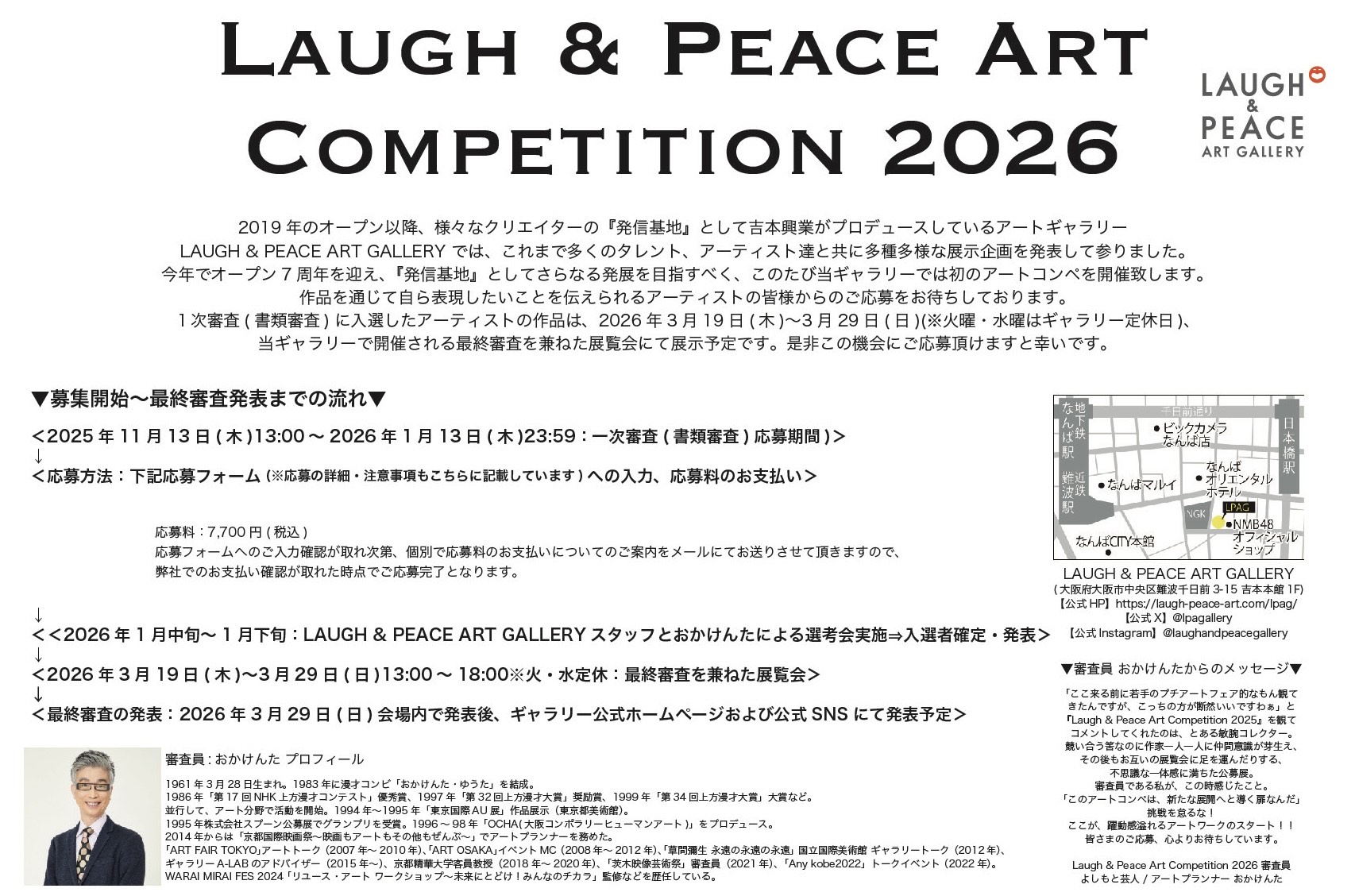 ・最終審査の発表:2026年3月29日(日)会場内で発表後、Laugh & Peace Art 公式ホームページ( https://laugh-peace-art.com/ )およびLaugh & Peace Art Gallery 公式SNSにて発表予定